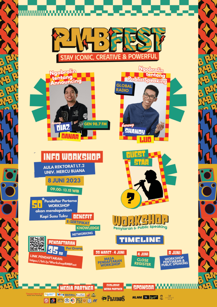 Pendaftaran Workshop Penyiaran & Public Speaking sendiri telah dibuka mulai 20 Maret 2023 – 4 Juni 2023 dan untuk biaya pendaftaran sebesar Rp 35.000/orang. Workshop akan dilaksanakan di Aula Rektorat Lt.2 Universitas Mercu Buana pada Kamis, 8 Juni 2023 dengan dua narasumber penyiar radio swasta yaitu, Diaz Danar yang merupakan Penyiar Gen 98,7 FM dan Shandy Luo yang merupakan Penyiar Global Radio. Untuk melakukan registrasi pendaftaran Workshop ini dapat melalui link berikut: https://bit.ly/WorkshopRMBFest